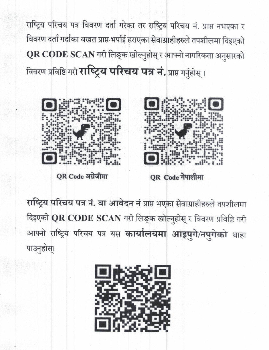 राष्ट्रिय परिचय पत्र नं. थाहा पाउन अथवा परिचयपत्र कार्यालयमा आए / नआएको जानकारीको लागि आवश्यक QR हरु